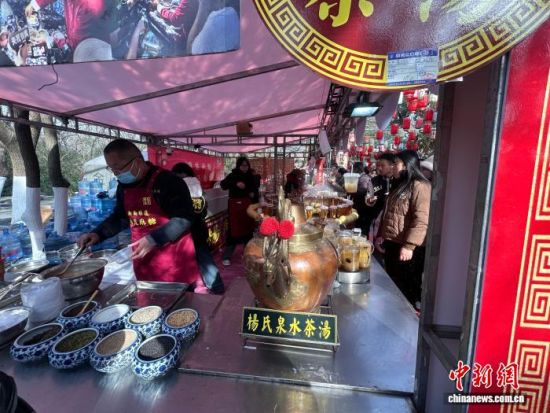 2月17日,大年初一,濟(jì)南千佛山新春游園會(huì)熱鬧開(kāi)場(chǎng),舞獅表演、新年大集等吸引民眾登山游玩。圖為新年大集上的泉水茶湯美食。李若楠 攝