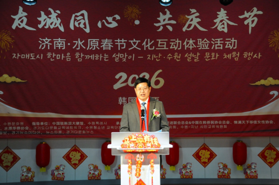 中國(guó)駐韓國(guó)大使館公參兼總領(lǐng)事鐘洪糯在“友城同心·共慶春節(jié)”濟(jì)南·水原春節(jié)文化互動(dòng)體驗(yàn)活動(dòng)上致辭。記者黃昕欣 攝