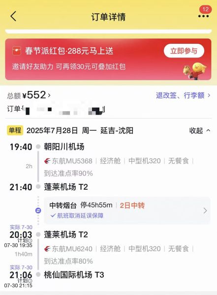 “我在在線旅游平臺(tái)檢索各個(gè)機(jī)場(chǎng),找那些在煙臺(tái)中轉(zhuǎn)且中轉(zhuǎn)時(shí)長(zhǎng)在2天及以上的航班。這種機(jī)票并不好找,需要一個(gè)個(gè)搜索!绷罢f(shuō),她最終找到了2025年7月28日從吉林延吉出發(fā)、在煙臺(tái)中轉(zhuǎn)、最終目的地是沈陽(yáng)的航班。