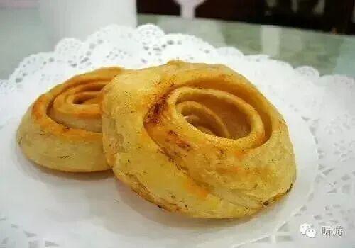 油旋要先烙后烤,烤好之后,蔥香濃郁,片片成旋,然而原料僅僅只有豬油、蔥、細鹽和面粉而已,所以油旋能夠如此美味,全靠精細的手藝。更有精細者,在油旋成熟后捅一空洞,磕入一個雞蛋,再入爐烘烤一會,雞蛋與油旋成為一體,吃起來口感更是綿柔酥脆。