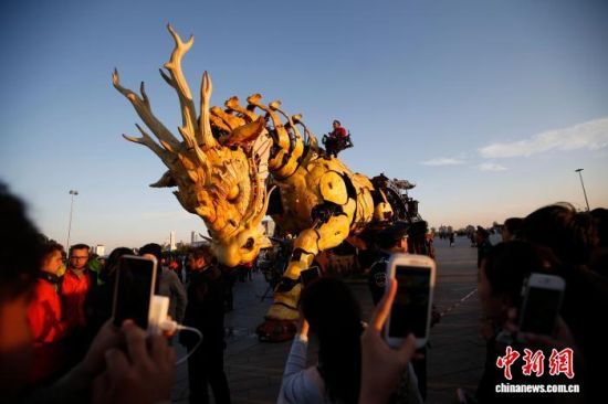 法國機械“龍馬”在北京鳥巢外試運行,吸引眾多市民觀看。中新社記者 杜洋 攝