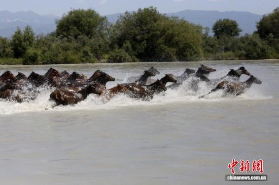 新疆昭蘇縣在特克斯河舉行“天馬浴河”表演。中新社記者 陶拴科 攝