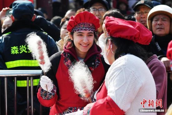 圖為留學(xué)生品嘗拔絲糖球。王海濱 攝
