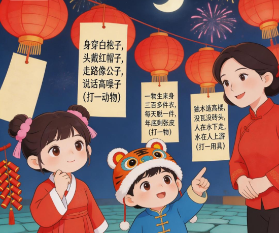 “猜燈謎”又叫“打燈謎”。每逢農(nóng)歷正月十五,傳統(tǒng)民間都要掛起彩燈,燃放焰火。后來,有人把謎語寫在紙條上,貼在五光十色的彩燈上,供人猜,增添節(jié)日氣氛。