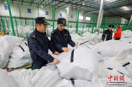 圖為海關(guān)工作人員在“前置監(jiān)管倉”對(duì)貨物進(jìn)行查驗(yàn)。孫大偉 攝
