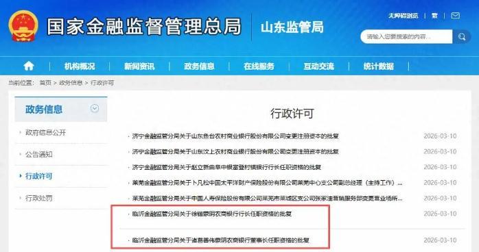 3月10日,國家金融監(jiān)督管理總局山東監(jiān)管局發(fā)布公告稱,臨沂金融監(jiān)管分局已核準(zhǔn)諸葛善偉山東蒙陰農(nóng)村商業(yè)銀行股份有限公司(下稱“蒙陰農(nóng)商銀行”)董事長的任職資格,核準(zhǔn)徐鍇蒙陰農(nóng)商銀行行長的任職資格,批復(fù)時間均為2026年3月4日。