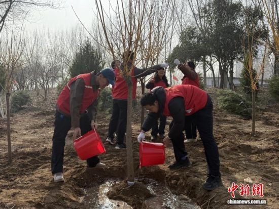 中新網(wǎng)濟(jì)南3月12日電(王采怡)“大伙熱情高漲,揮鍬鏟土、扶苗填坑、提水澆灌,各個(gè)環(huán)節(jié)銜接有序,今天我們一共栽下1000多株新樹苗!3月12日,在菏澤市鄄城縣黃河大堤臨濮段,志愿者王士杰和他的同事們正在進(jìn)行植樹活動(dòng)。據(jù)了解,今年鄄城縣計(jì)劃栽植各類綠化苗木17000余株,補(bǔ)綠面積500多畝。