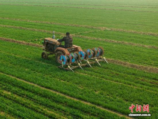驚蟄過后,聊城市茌平區(qū)的麥田陸續(xù)返青。在振興街道豐樂農(nóng)民種植專業(yè)合作社的農(nóng)田里,拖拉機(jī)轟鳴作業(yè)。當(dāng)?shù)氐霓r(nóng)灌設(shè)施安裝戶劉曰忠一早便開著拖拉機(jī)下了地,他身后的滴灌鋪設(shè)機(jī)械隆隆前行,黑色的滴灌帶順著田壟鋪開,接頭處由工人現(xiàn)場(chǎng)完成安裝。