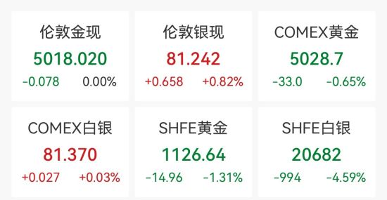 截至發(fā)稿,黃金白銀悉數(shù)反彈。倫敦金現(xiàn)持平,報(bào)5018.02美元/盎司;COMEX黃金跌0.65%,報(bào)5028.7美元/盎司;倫敦銀現(xiàn)漲0.82%,報(bào)81.242美元/盎司;COMEX白銀漲0.03%,報(bào)81.37美元/盎司。
