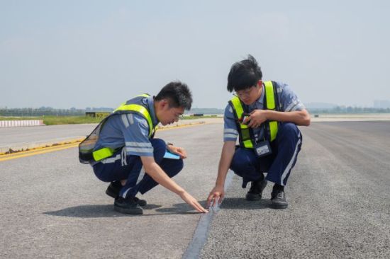 場區(qū)管理員進(jìn)行巡視滑行道道面。(青島機(jī)場供圖)
