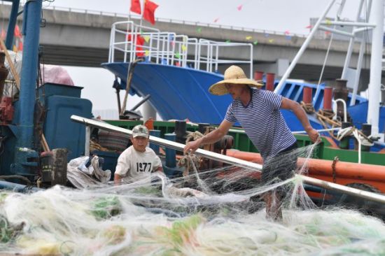 8月28日,在山東省青島市城陽區(qū)河套街道漁港碼頭,漁民在整理網(wǎng)具上船。王海濱 攝