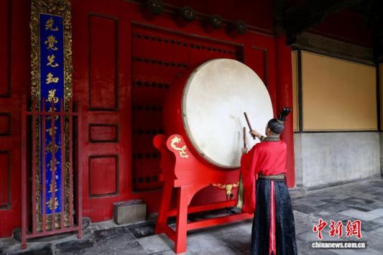 9月28日,乙巳年公祭孔子大典在山東曲阜舉行。工作人員擊鼓鳴鐘。中新社記者 李明芮 攝