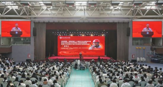 在黃海體育館,郭明義作主題報(bào)告!爸袊(guó)人有智慧,有干勁,一定會(huì)干出一番驚天動(dòng)地的事業(yè)!”郭明義從中國(guó)式現(xiàn)代化書寫的兩個(gè)“前所未有”的壯舉入題,結(jié)合自身的實(shí)踐經(jīng)驗(yàn),深刻解讀了黨的二十屆四中全會(huì)精神。