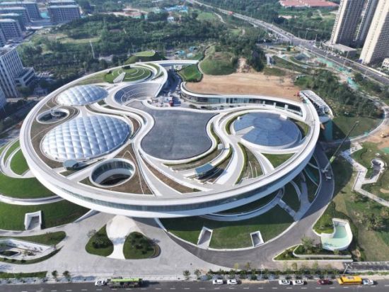 該項目位于青島市嶗山區(qū),建筑面積10.4萬平方米,定位為新型產(chǎn)業(yè)用地,是青島市虛擬現(xiàn)實產(chǎn)業(yè)園綜合配套區(qū)的核心項目。整體設(shè)計以“平行世界”為理念,通過建筑與自然山體的有機(jī)融合,打破虛實邊界。建筑外觀采用夢幻飛碟造型,屋面綜合運(yùn)用景觀水池、太陽能光伏、種植屋面、覆土坡地及鋼結(jié)構(gòu)ETFE膜等工藝,融入中國傳統(tǒng)“五行”元素,形成獨(dú)特的“五行天眼”視覺效果。