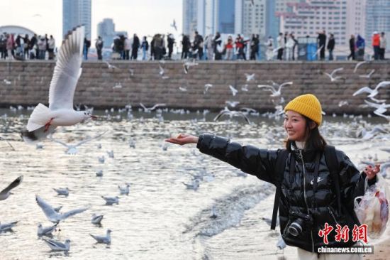 12月2日,游客在青島棧橋附近投喂海鷗。梁犇 攝