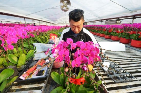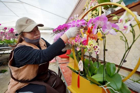 1月27日,花農(nóng)在裝飾訂單蝴蝶蘭。王海濱 攝