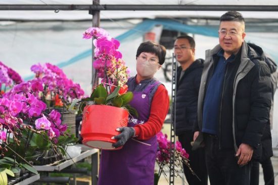 1月27日,花農(nóng)在運(yùn)送訂單蝴蝶蘭。王海濱 攝