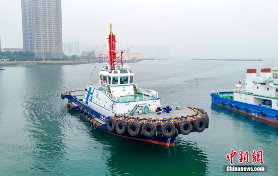 6月26日,“氫電拖1”輪緩緩靠泊碼頭。當(dāng)日,中國(guó)首艘氫電拖輪“氫電拖1”輪26日在山東港口青島港投用。據(jù)測(cè)算,較傳統(tǒng)燃油拖輪,該輪預(yù)計(jì)每年可減少二氧化碳排放量達(dá)1500余噸,標(biāo)志著中國(guó)在氫能船舶應(yīng)用領(lǐng)域?qū)崿F(xiàn)突破。(無(wú)人機(jī)照片)張進(jìn)剛 攝