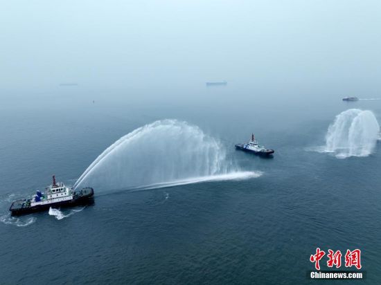 6月26日,“氫電拖1”輪駛過(guò)“水門(mén)禮”。當(dāng)日,中國(guó)首艘氫電拖輪“氫電拖1”輪26日在山東港口青島港投用。據(jù)測(cè)算,較傳統(tǒng)燃油拖輪,該輪預(yù)計(jì)每年可減少二氧化碳排放量達(dá)1500余噸,標(biāo)志著中國(guó)在氫能船舶應(yīng)用領(lǐng)域?qū)崿F(xiàn)突破。(無(wú)人機(jī)照片)張進(jìn)剛 攝