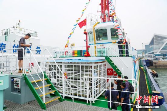 6月26日,攝影師拍攝“氫電拖1”輪的氫儲(chǔ)能罐。當(dāng)日,中國(guó)首艘氫電拖輪“氫電拖1”輪26日在山東港口青島港投用。據(jù)測(cè)算,較傳統(tǒng)燃油拖輪,該輪預(yù)計(jì)每年可減少二氧化碳排放量達(dá)1500余噸,標(biāo)志著中國(guó)在氫能船舶應(yīng)用領(lǐng)域?qū)崿F(xiàn)突破。張進(jìn)剛 攝