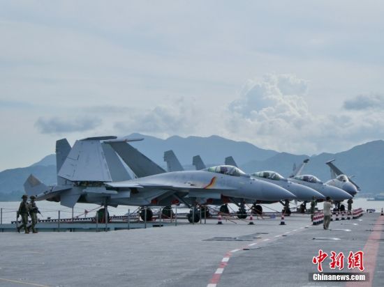 7月4日,山東艦舉行開放參觀活動(dòng)。據(jù)了解,由中國人民解放軍海軍航空母艦山東艦,導(dǎo)彈驅(qū)逐艦延安艦、湛江艦及導(dǎo)彈護(hù)衛(wèi)艦運(yùn)城艦組成的航母編隊(duì)抵達(dá)香港,開啟為期5天的訪問活動(dòng)。圖為一架殲-15T艦載機(jī)停放在起飛位。這是中國國產(chǎn)新型艦載機(jī)殲-15T首次在航母甲板對(duì)公眾開放參觀。中新社記者 戴夢(mèng)嵐 攝