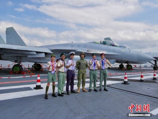 7月4日,山東艦舉行開放參觀活動(dòng)。據(jù)了解,由中國人民解放軍海軍航空母艦山東艦,導(dǎo)彈驅(qū)逐艦延安艦、湛江艦及導(dǎo)彈護(hù)衛(wèi)艦運(yùn)城艦組成的航母編隊(duì)抵達(dá)香港,開啟為期5天的訪問活動(dòng)。圖為香港制服團(tuán)體成員與一位山東艦士兵(右三)、殲-15T艦載機(jī)合影。
